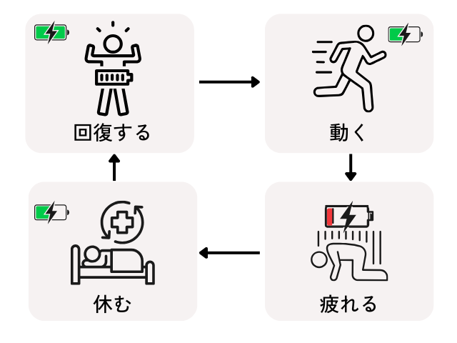 人の体は、 動く →疲れる→ 休む→回復するという流れを繰り返しながら成り立っています。疲れが溜まった状態から、回復させる時に、どれだけ早く効率よく元気な状態まで回復させられるか?